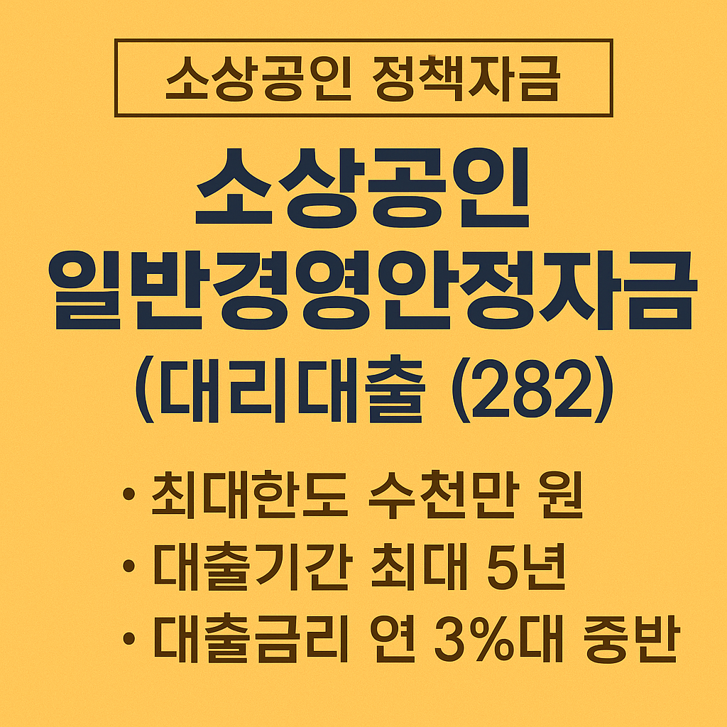 소상공인 일반경영안정자금(대리대출 282)은 소상공인의 경영 부담을 줄이고 안정적인 자금 운용을 돕기 위해 지원되는 정책자금입니다. 대리대출 방식으로 운영되며, 소상공인시장진흥공단(소진공)과 협약 은행이 협력하여 대출이 실행됩니다.