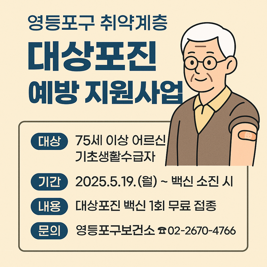 영등포구는 75세 이상 취약계층 어르신을 대상으로 2025년 5월 19일부터 대상포진 무료 예방접종을 시행합니다. 진료비 부담을 줄이고 고령자의 건강권을 강화하기 위해 마련된 이번 사업은 백신 소진 시까지 진행됩니다.