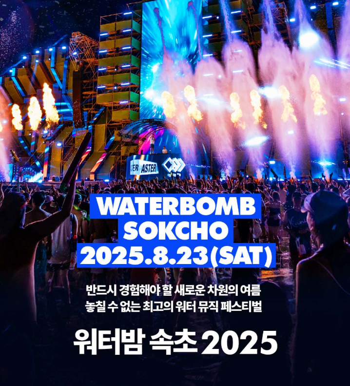 국내 대표 여름 뮤직 페스티벌인 워터밤은 강원 속초에서 열리는 여름 시즌 최고의 이벤트입니다. 물이 터지고 음악이 울려 퍼지는 순간, 진정한 여름이 시작됩니다. 2025년 워터밤 속초는 더 커지고, 더 화려하게 돌아왔습니다!