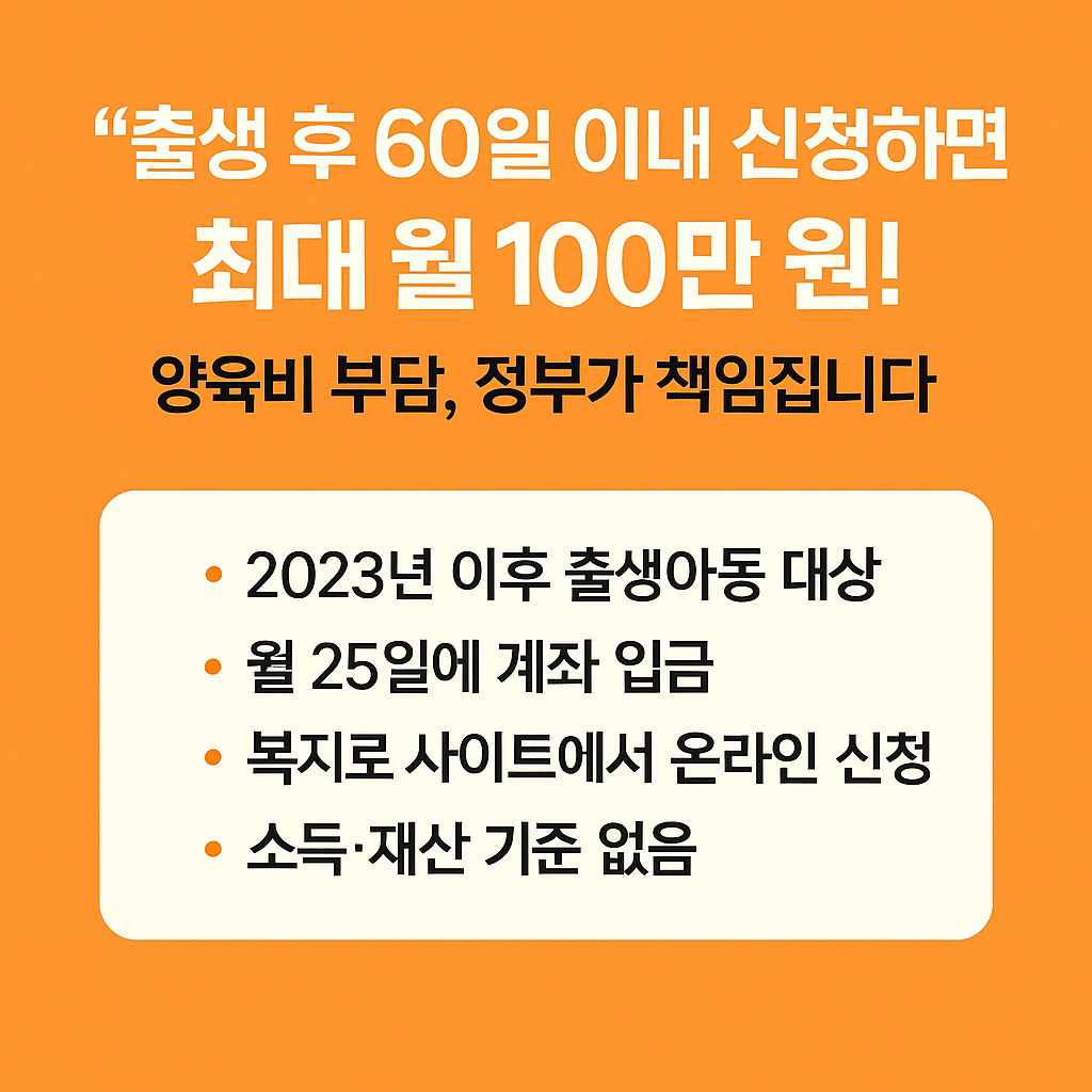 매달 최대 100만 원 지원으로 초기 양육비 부담을 크게 줄일 수 있습니다.